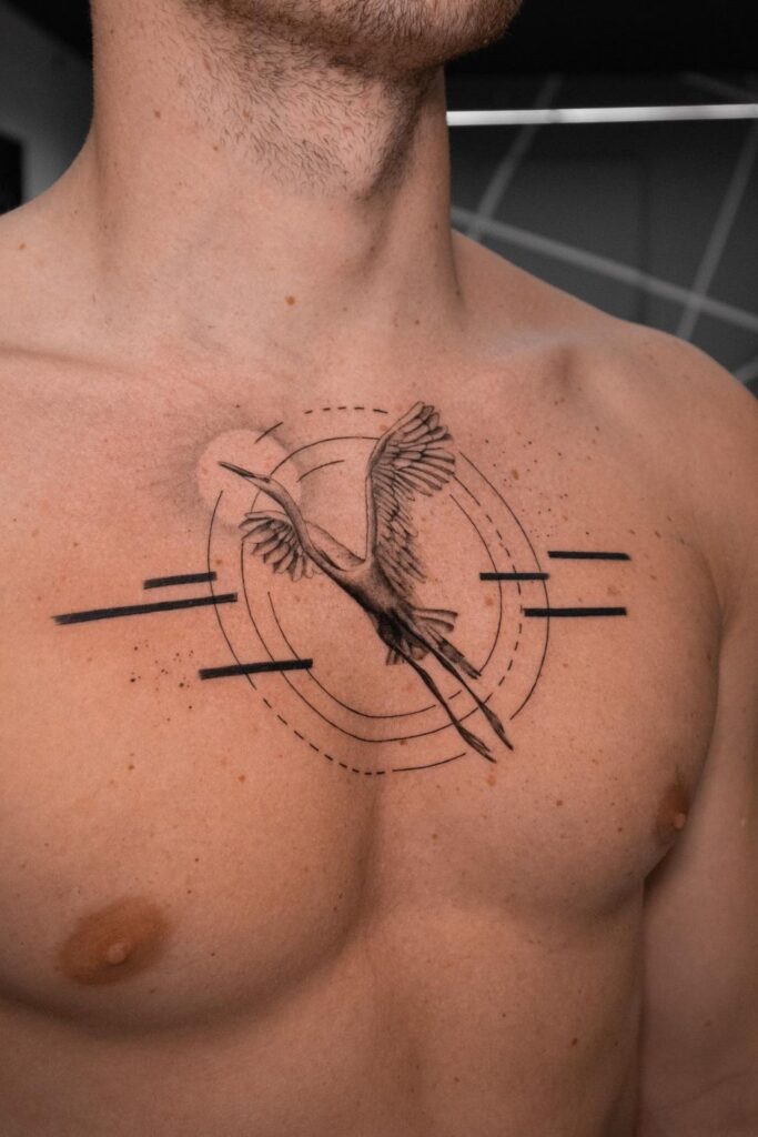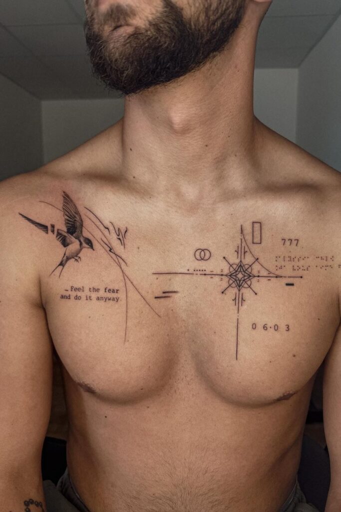 This minimalist yet deeply symbolic chest tattoo features a fine-line bird in motion, surrounded by geometric symbols and meaningful numbers.