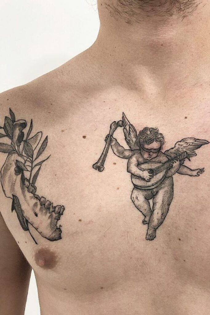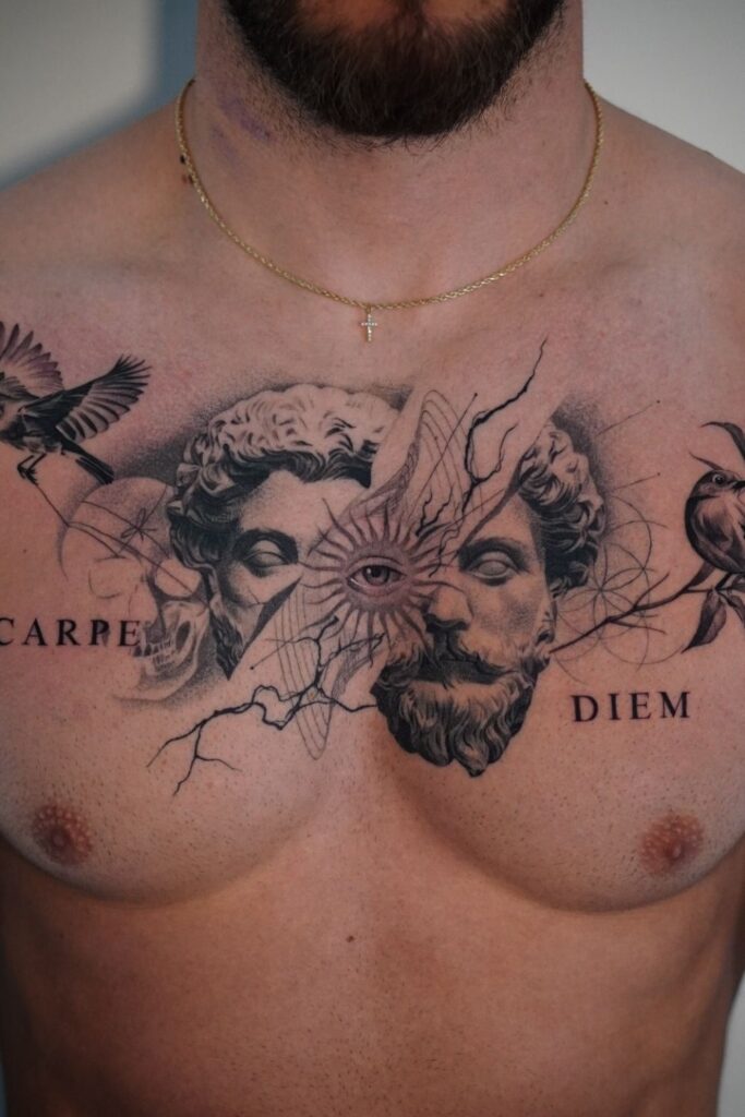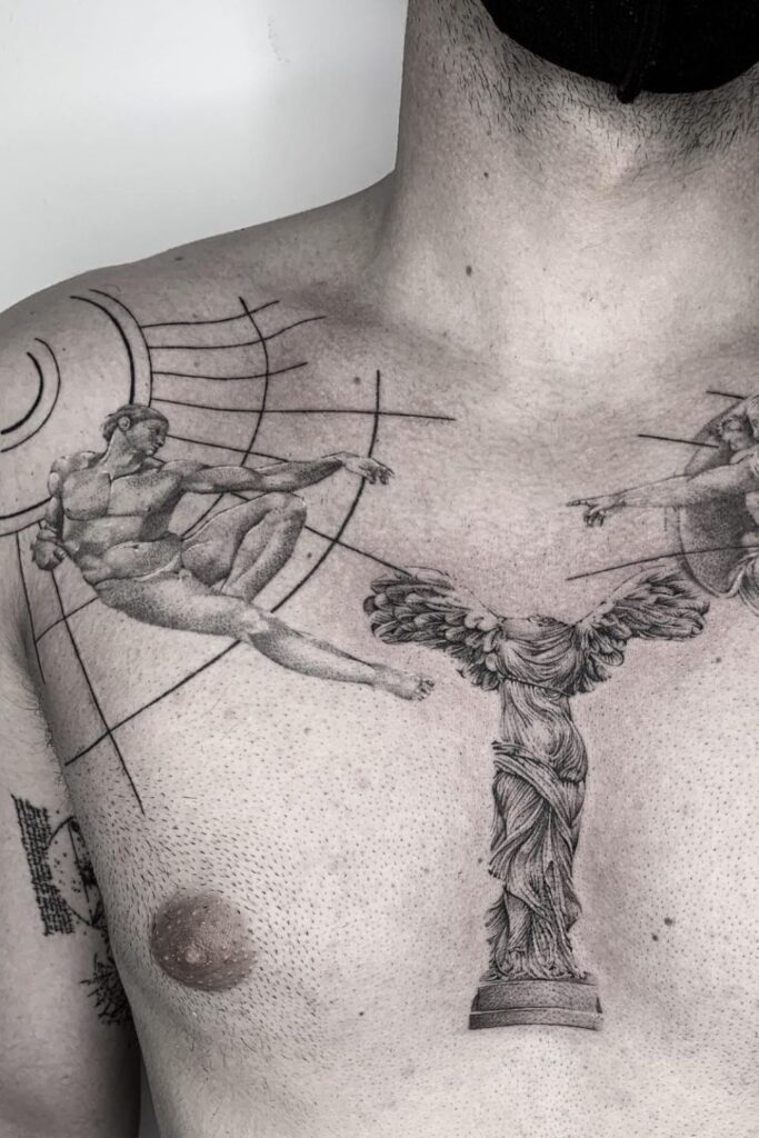 This masterpiece-inspired chest tattoo features intricate fine-line shading and elements from Renaissance sculptures and classical paintings.