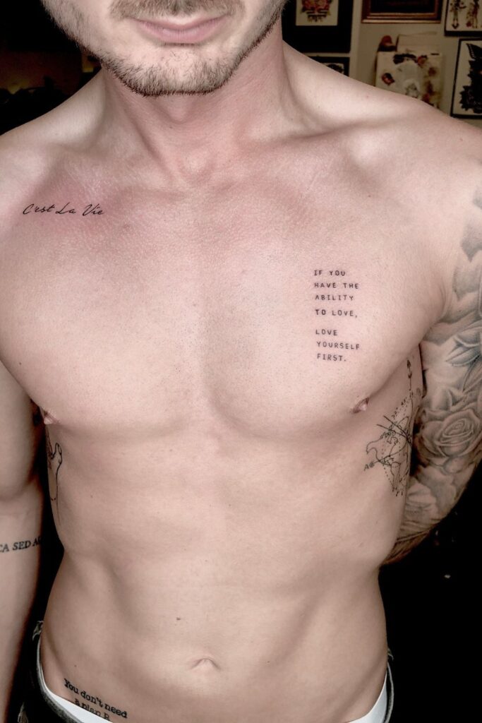 This elegant, fine-line text tattoo includes the phrases “C’est La Vie” (Such is life) and “If you have the ability to love, love yourself first.”