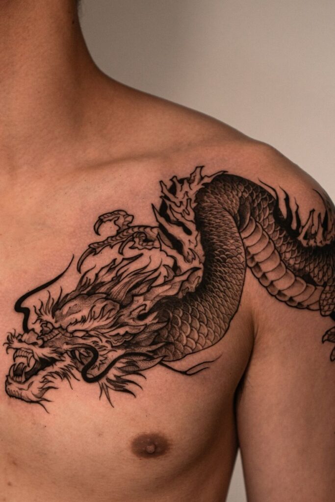 The intricate scales and flowing movement make it a stunning, timeless design for those who love Asian mythology and bold chest tattoos.