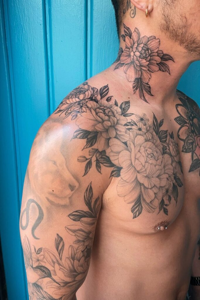 This stunning floral chest piece extends to the shoulder and neck, blending soft, delicate flowers with a powerful lion face hidden within.