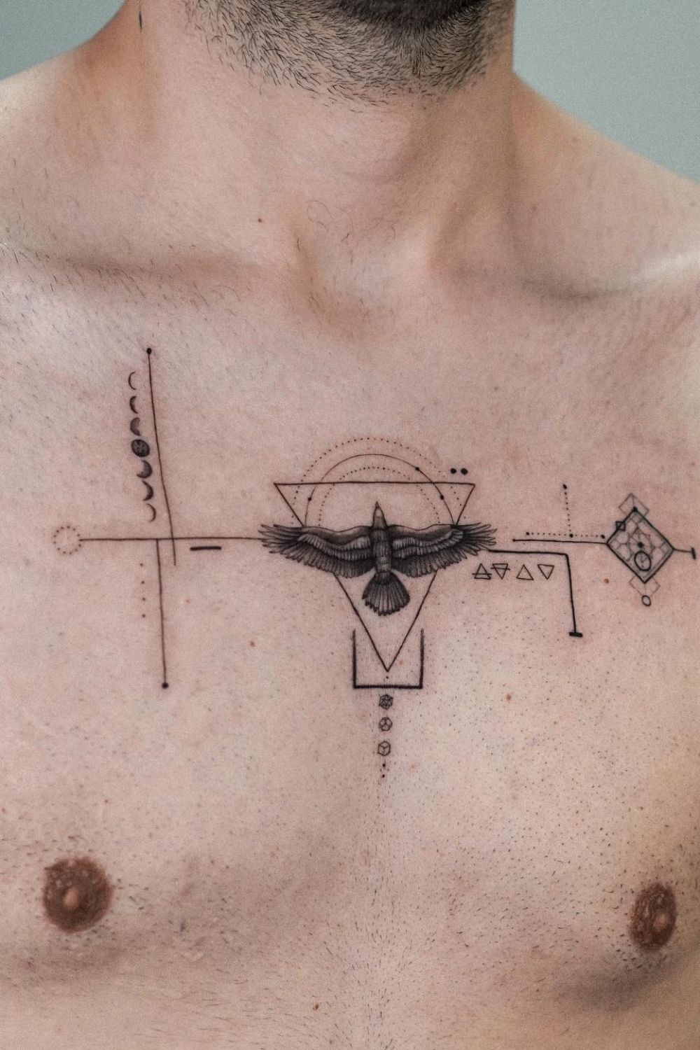 Abstract Geometric Chest Tattoo with Bird & Symbols