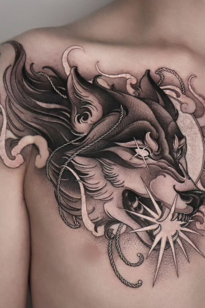 Stylized Neo-Japanese Wolf Chest Tattoo
