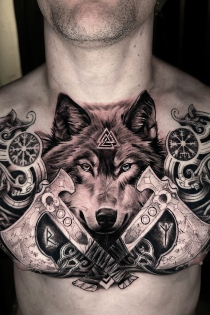 Viking-Inspired Wolf & Axe Chest Tattoo