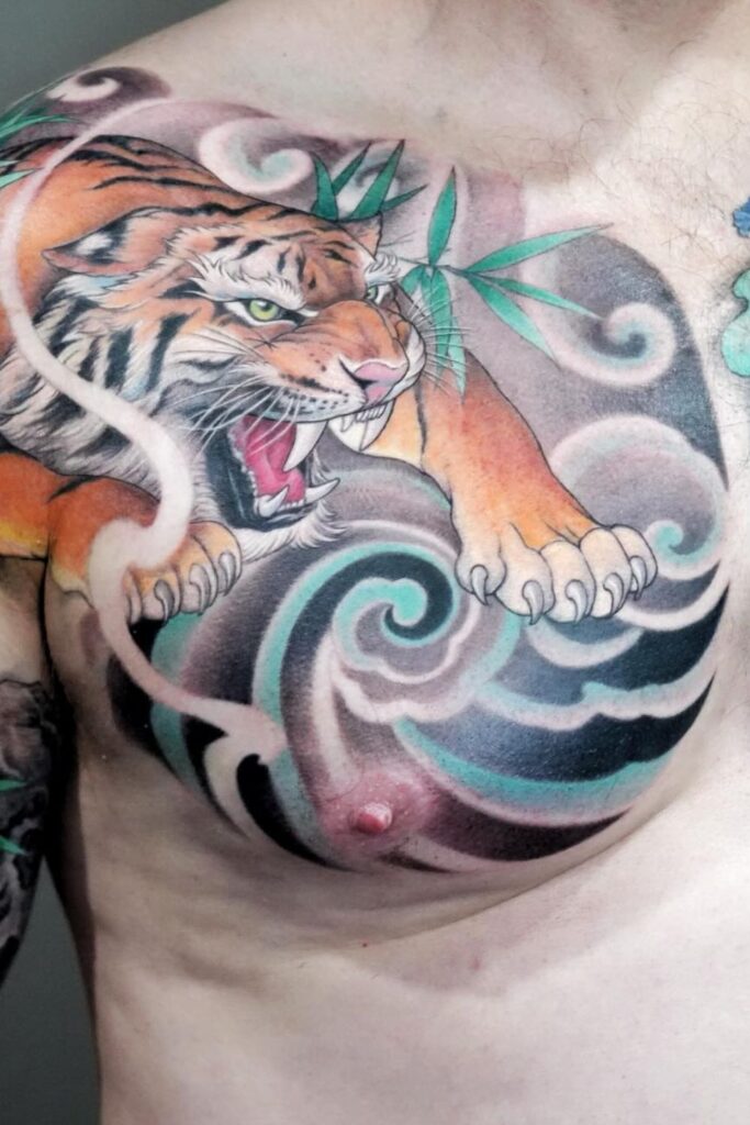 A vibrant and dynamic Japanese-style tattoo, showcasing a fierce tiger amidst swirling waves and bamboo leaves.