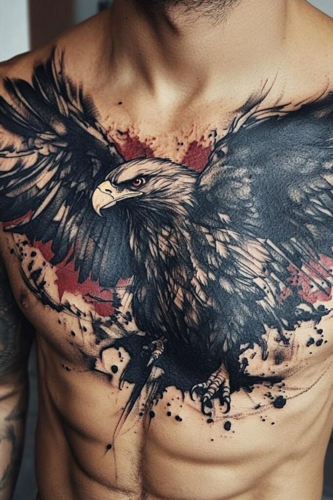 This stunning eagle chest tattoo combines realistic detailing with bold watercolor splashes, creating a dynamic and fierce design.
