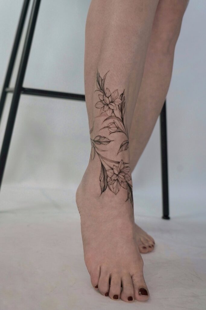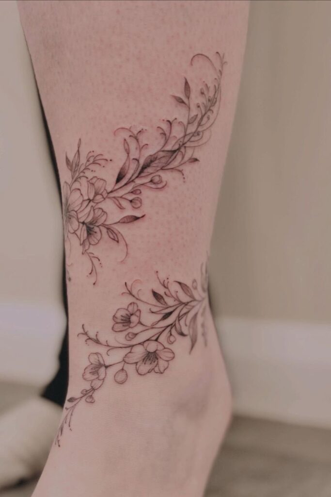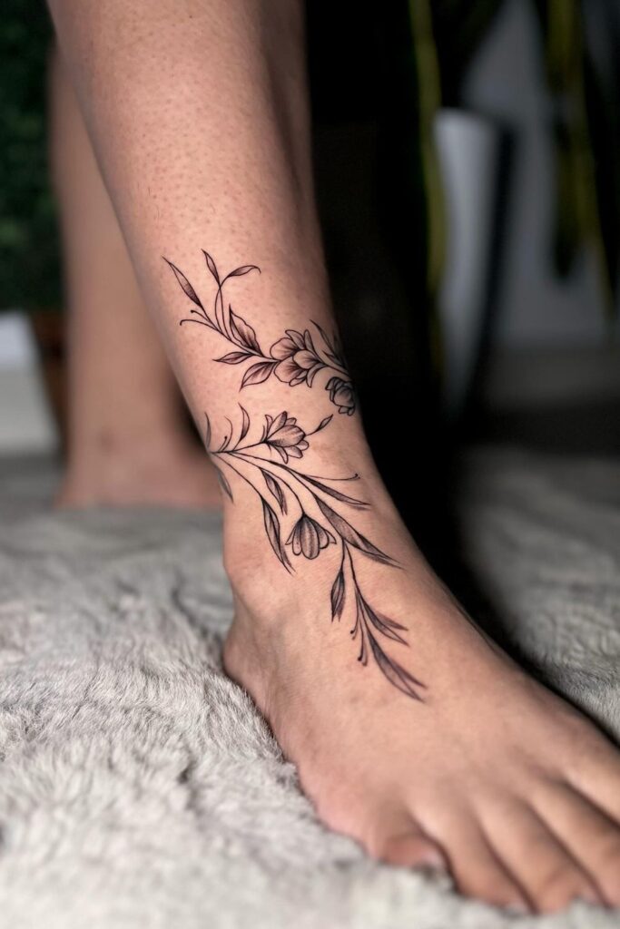 The elongated leaves and blossoming flowers climb up the ankle and across the foot, creating a sense of movement and growth.