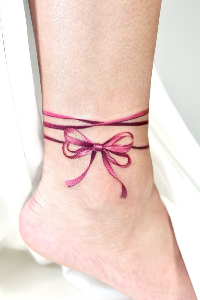 This eye-catching ankle tattoo for women by yoda_ink features a hyper-realistic satin ribbon tied into a charming pink bow.