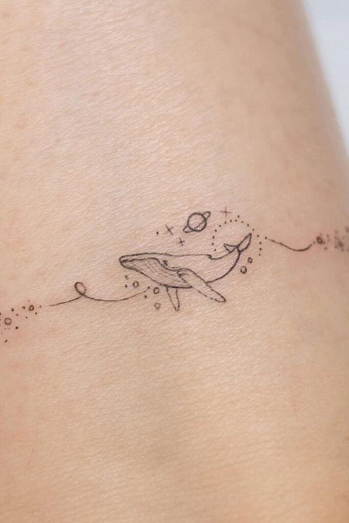 This dainty ankle tattoo by handitrip features a graceful whale swimming through a dotted cosmic path, surrounded by planets and stars.