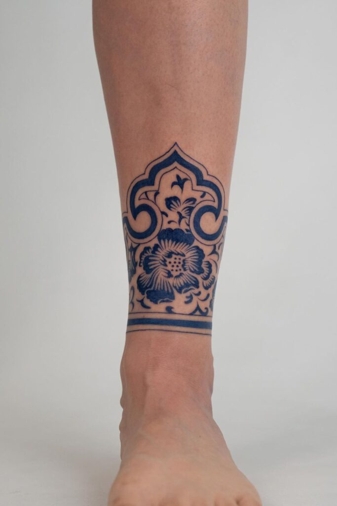 Inspired by classic tilework and ornate ceramics, this deep blue ankle cuff tattoo by saki.lss feels regal and rooted in heritage.
