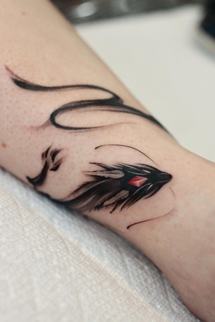 This powerful black and grey ankle tattoo by tattooist_mate depicts a sleek, abstract dragon with flowing ink strokes that mimic smoke and motion.