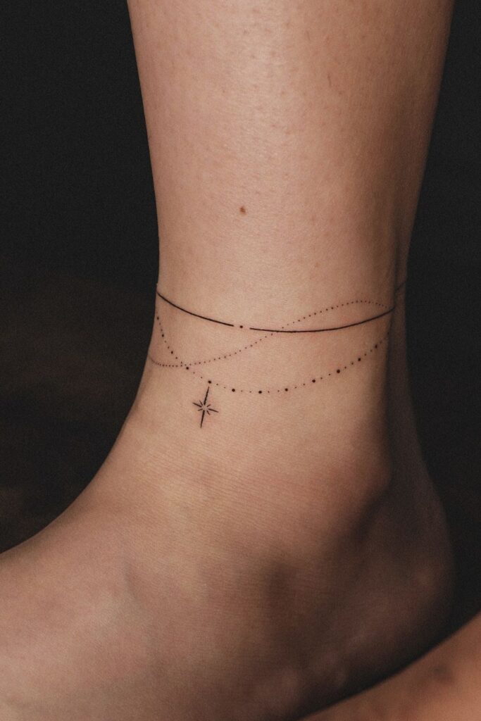 Delicate dots and lines form a celestial anklet, complete with a guiding star by by orma_tattoo.