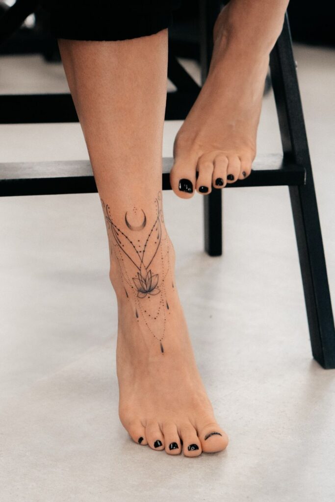 Surrounding dotted chains and soft extensions give it a jewelry-like effect, turning the ankle into a canvas of sacred geometry.