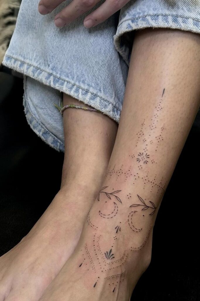 With leaf accents and gentle arcs, the tattoo gives the impression of a cosmic anklet drawn from dreams.
