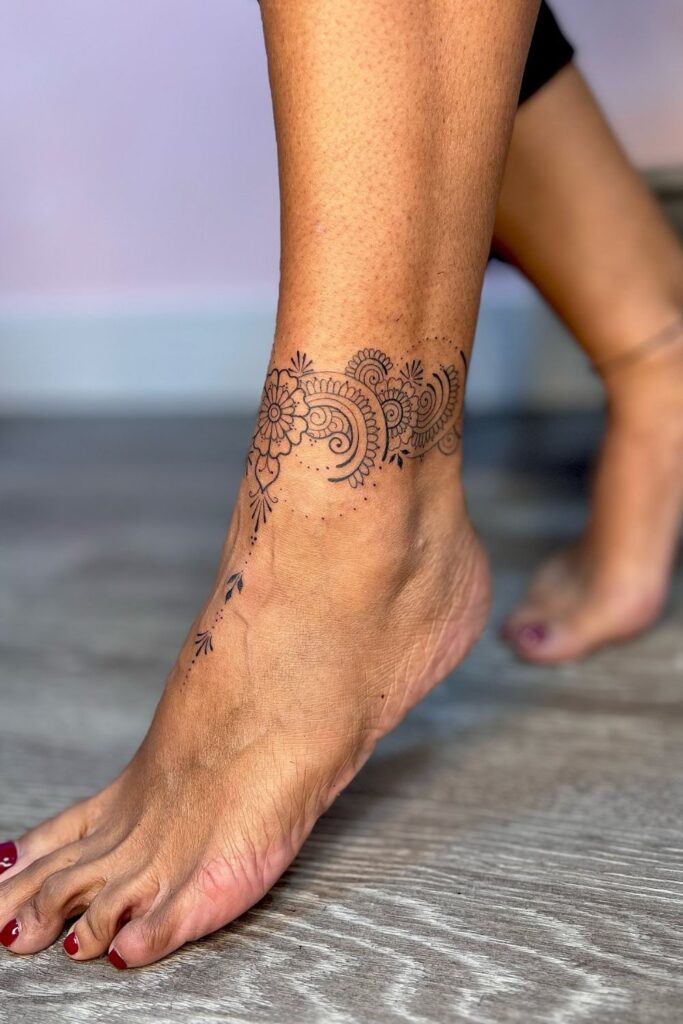 Drawing from traditional mehndi artistry, this ankle bracelet tattoo for women by nikkitattoox weaves floral and paisley elements into a captivating band around the ankle.