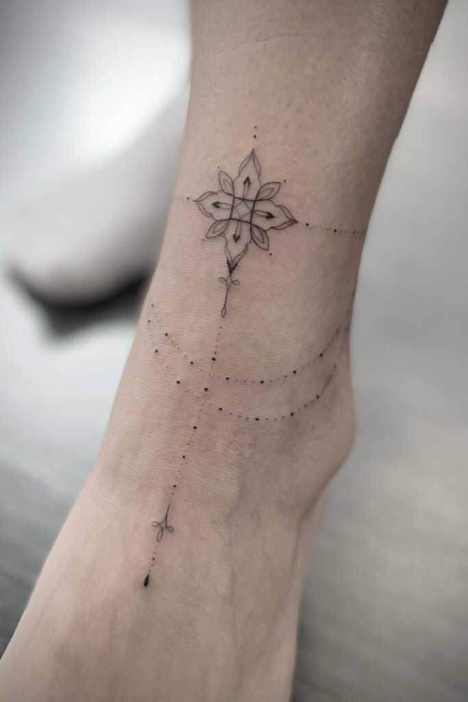 This mesmerizing tattoo by nnenaya features a fine line flower ankle bracelet tattoo in a stylized star or mandala shape, radiating serenity and symmetry.
