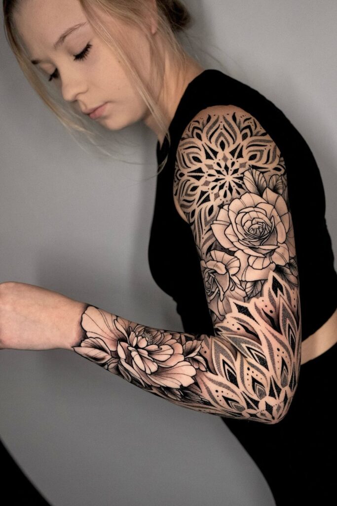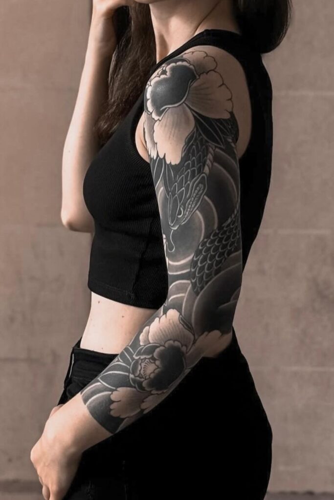 This tattoo is ideal for women who love feminine tattoo sleeves but also want a bold and artistic edge, blending strength with elegance.