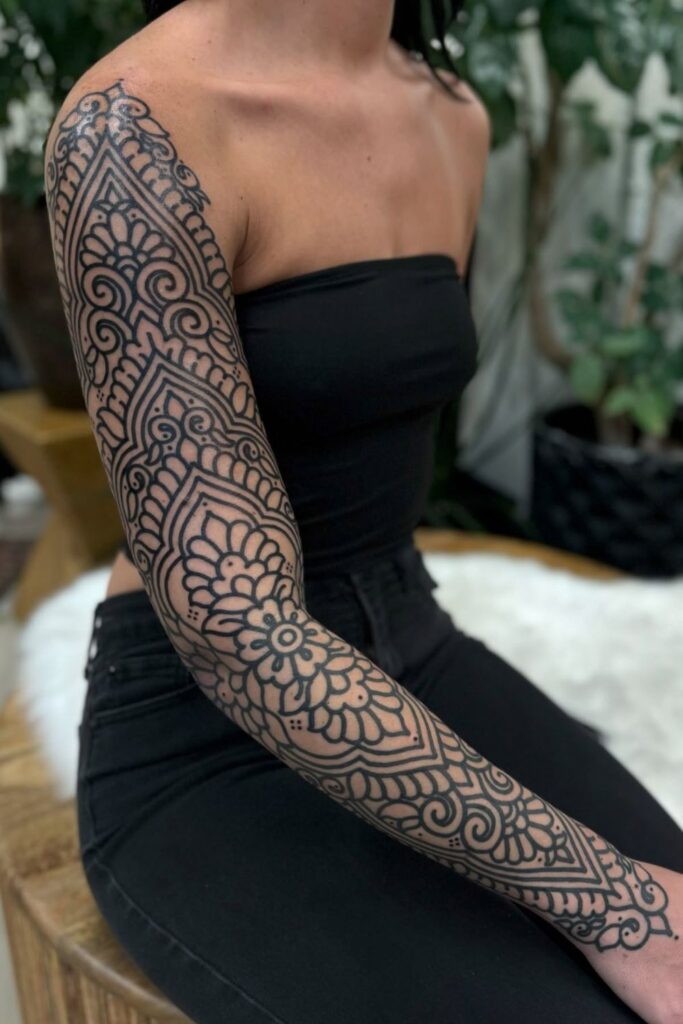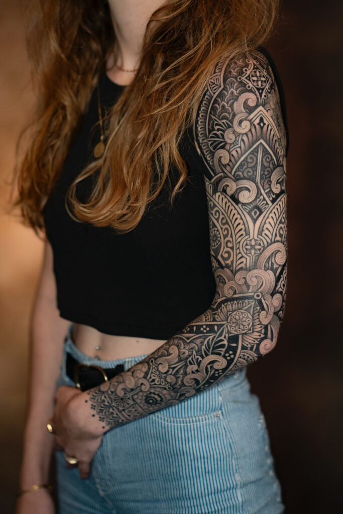 This ornamental sleeve tattoo by “dino_vallely” is a masterpiece of geometric patterns and fine line details, creating a structured yet elegant design.