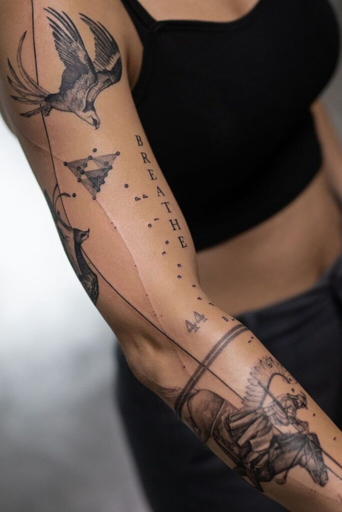 This delicate fine-line tattoo sleeve by “hood.seven.concepts” beautifully incorporates a soaring bird, geometric constellations, and an indigenous warrior on horseback, all connected by a subtle, flowing design.