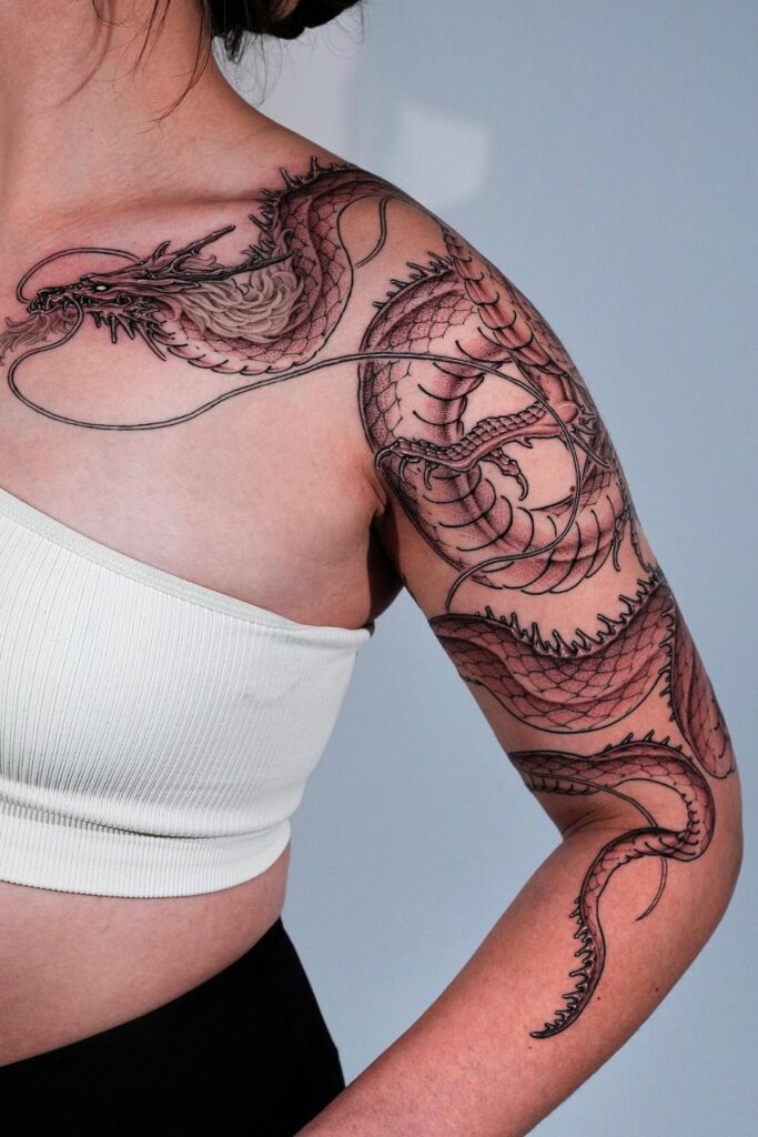 This stunning Japanese-inspired dragon tattoo by “tattooer_intat” wraps around the arm and extends over the shoulder, creating a bold and powerful statement.