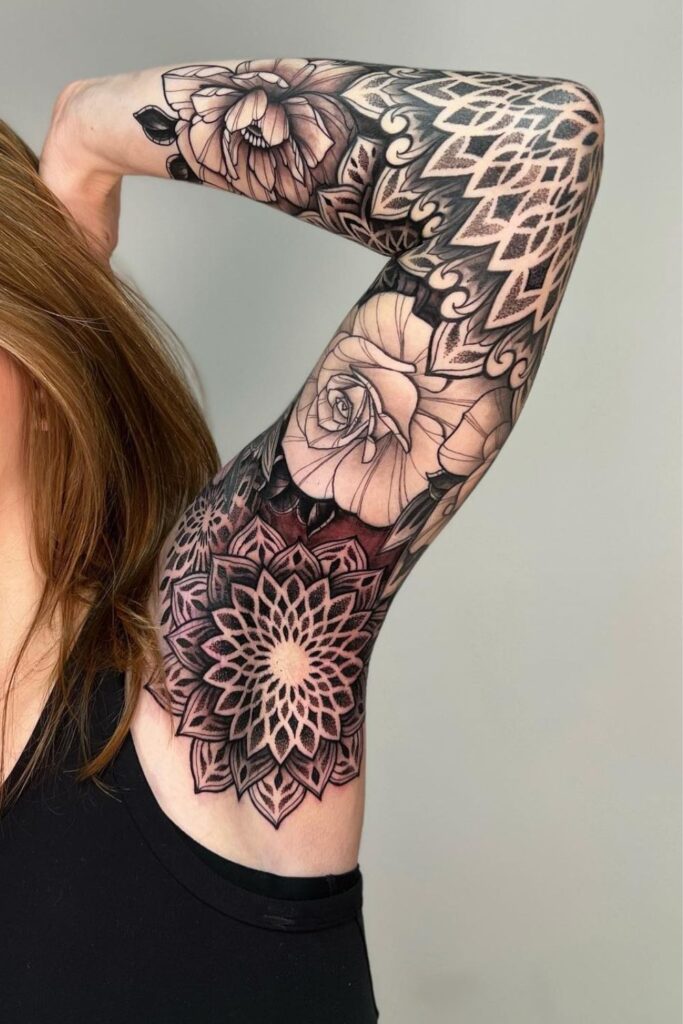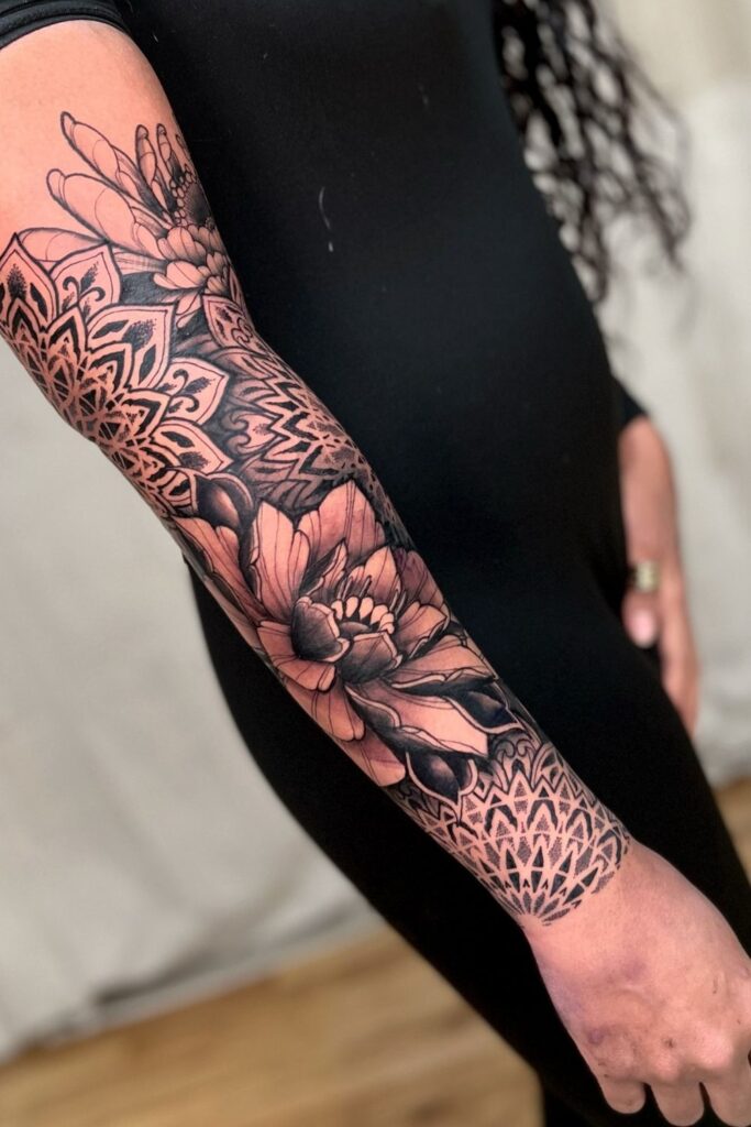 This floral and mandala-inspired arm sleeve tattoo by “fleur.tattoos” blends bold linework with intricate details, creating a mesmerizing effect.