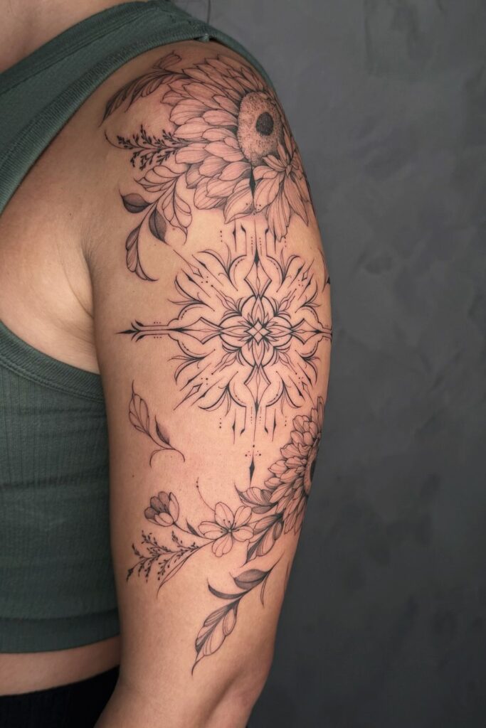 A graceful tattoo that combines a large sunflower with geometric mandala elements by “gabriela.tattoo“, this design radiates positivity, warmth, and personal strength.