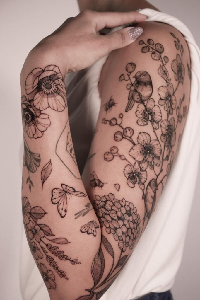 Feminine & Delicate Art: If you’re drawn to feminine tattoo sleeves, consider delicate designs that incorporate floral elements, butterflies, celestial symbols, or watercolor-style tattoos.