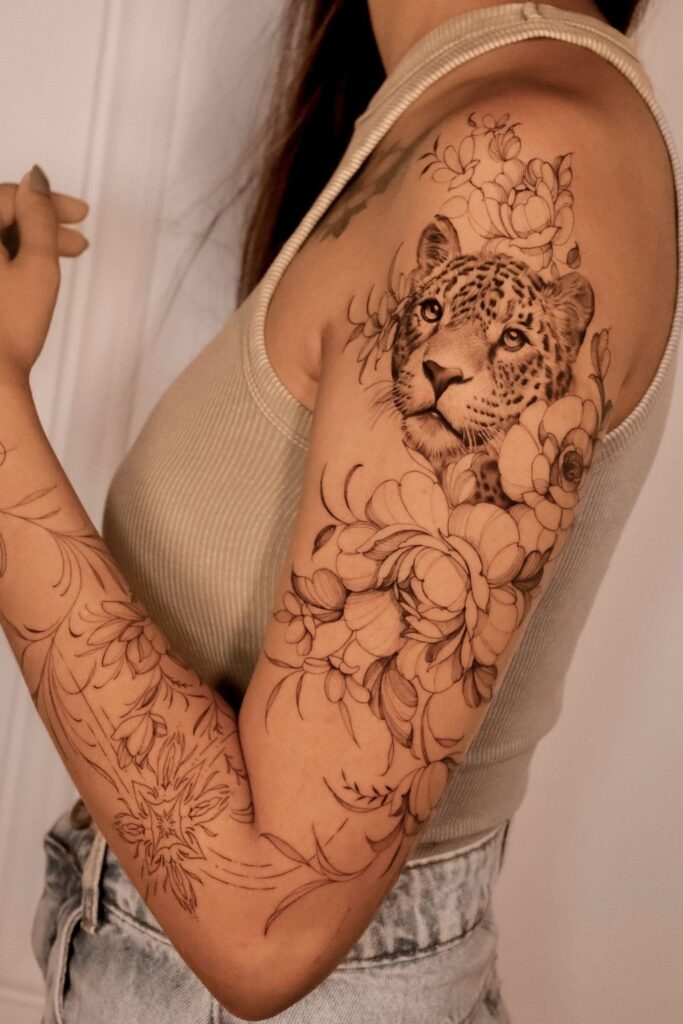 This breathtaking tattoo sleeve by “diegoaugustoart” combines the powerful image of a jaguar with delicate floral accents, symbolizing strength, intuition, and feminine power.