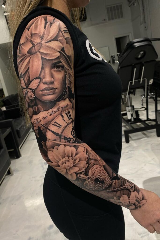 A powerful portrait sleeve tattoo by “jessatattoos” featuring a woman’s face surrounded by butterflies, floral accents, a vintage clock, and the phrase “This too shall pass.”