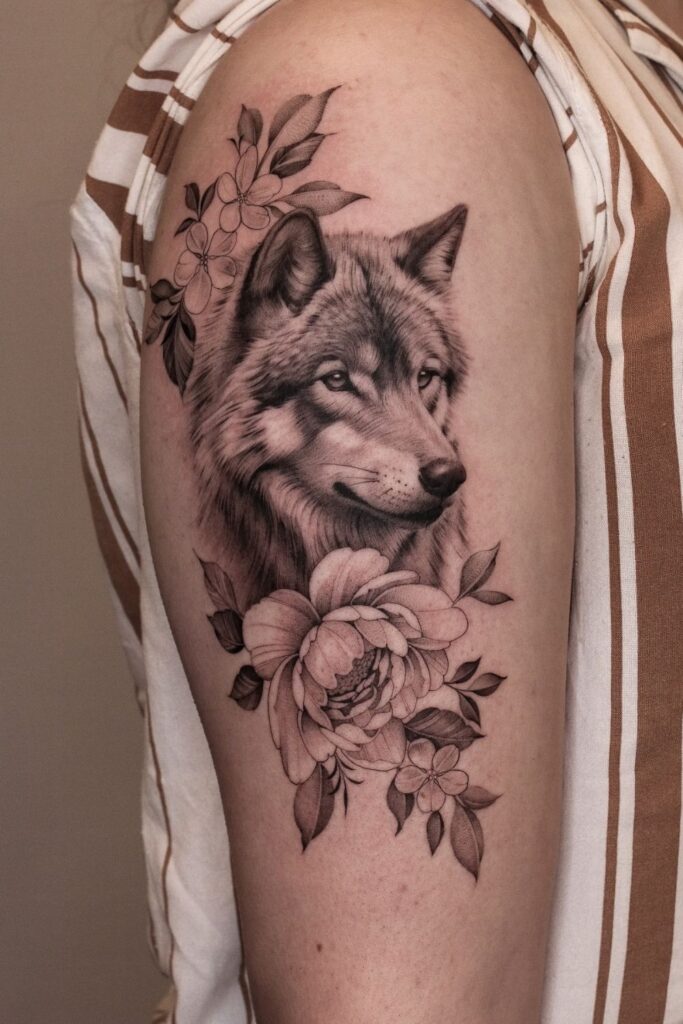 This realistic wolf tattoo sleeve by “rachaelsawtelltattoo” is a symbol of loyalty, intuition, and strength, beautifully paired with floral elements that add a touch of grace and femininity.