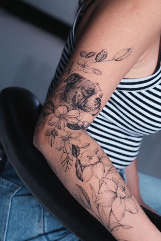 A heartfelt and sentimental tattoo by “d.vancasso.ink“, this sleeve features a beautifully shaded dog portrait surrounded by floral elements, creating a timeless tribute to a beloved pet.