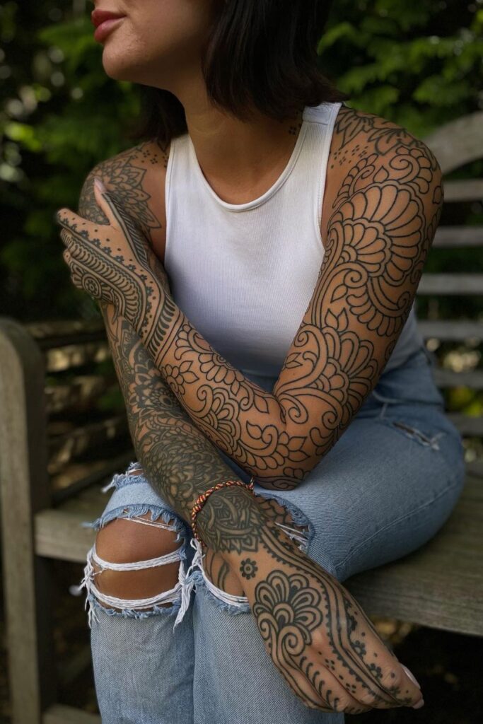 This mesmerizing full-sleeve and hand tattoo by “lennblacklotus” showcases intricate ornamental patterns that flow seamlessly across the skin.