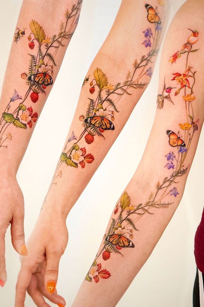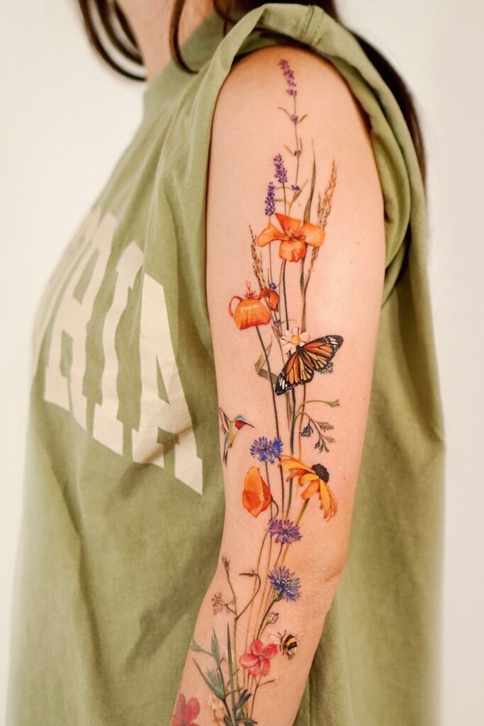 A stunningly delicate tattoo by “abii_tattoo” featuring vibrant wildflowers, a monarch butterfly, and a hummingbird, this piece captures the beauty of life’s fleeting yet meaningful moments.