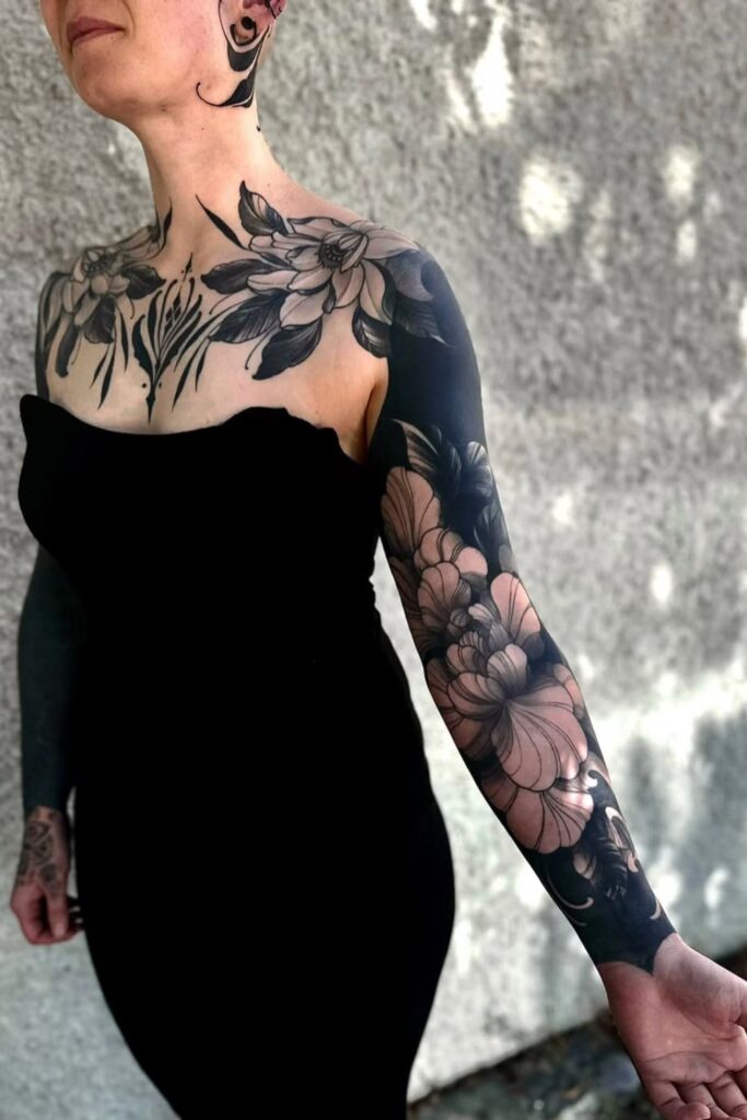 Bold Floral Blackout Sleeve & Chest Tattoo