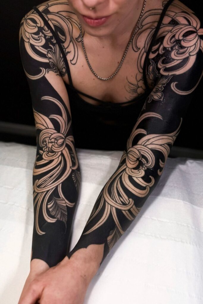 This breathtaking floral blackout tattoo by “sarahrose_tattoo” seamlessly extends from the arm to the chest, creating a striking contrast between the dark ink and the delicate floral designs.