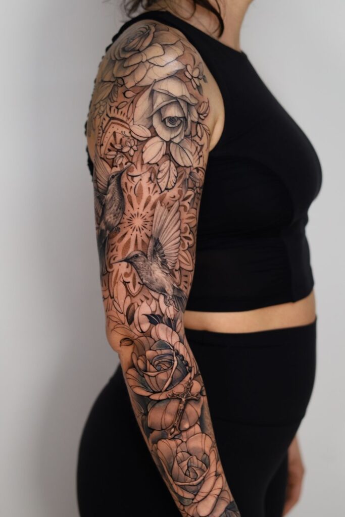 This intricately detailed floral tattoo by “ami.tats” incorporates roses, hummingbirds, and ornamental designs, creating a delicate yet visually stunning sleeve.