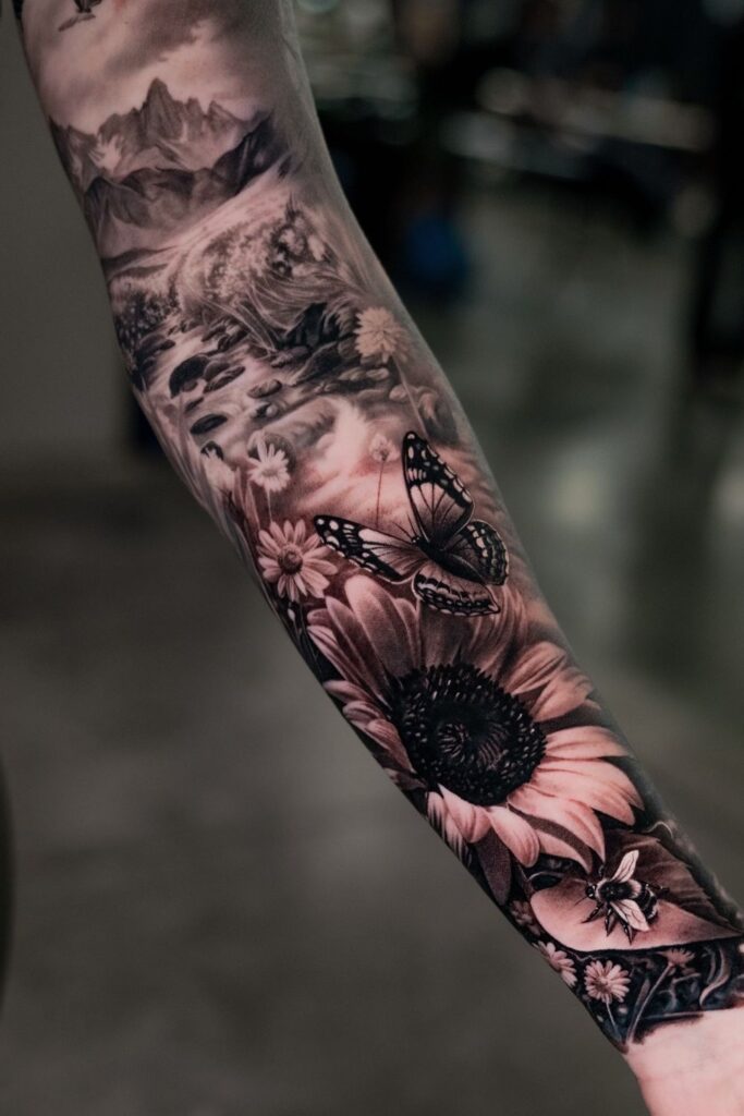This hyper-realistic sleeve tattoo by “quinhernandez” beautifully merges sunflowers, butterflies, and a mountain landscape, creating a breathtaking representation of growth, freedom, and transformation.