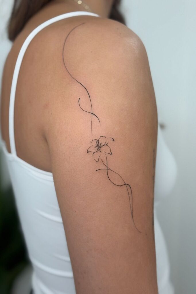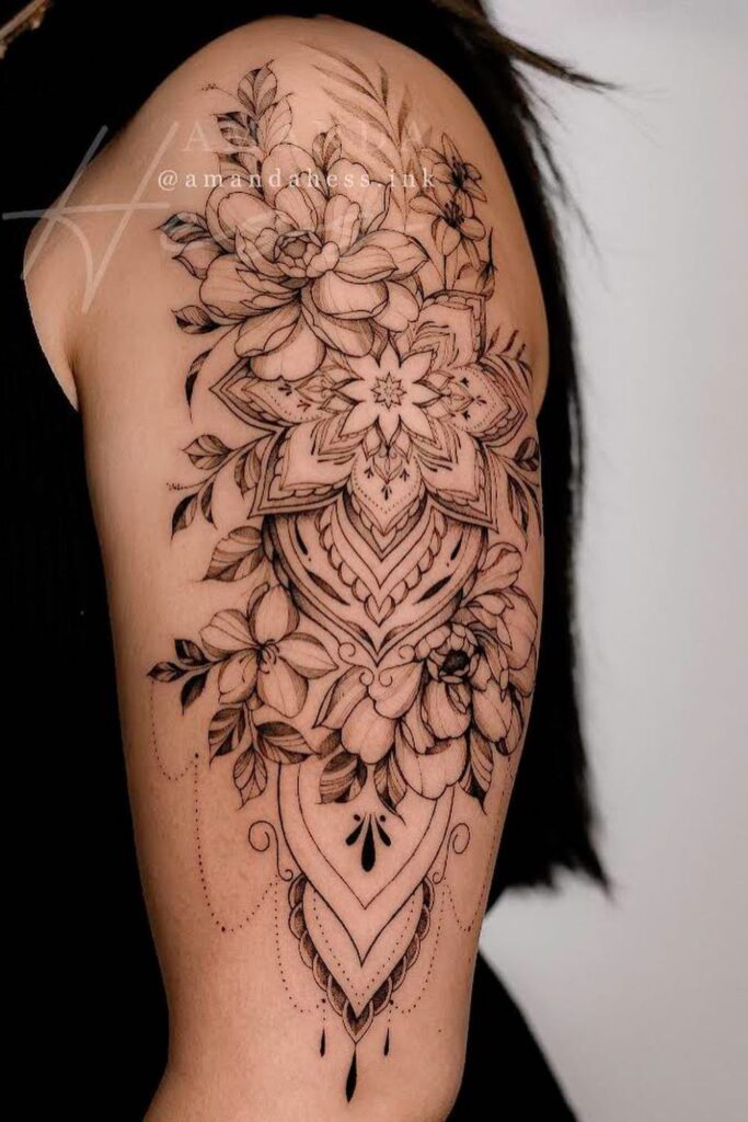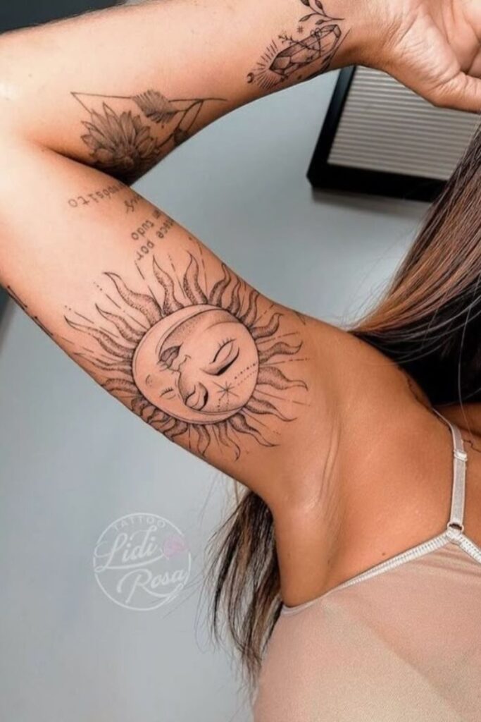 If you’re thinking of getting a top of arm tattoo, consider something that complements the natural movement of your arm, such as celestial patterns, fine-line florals, or symbolic designs that represent balance and beauty.