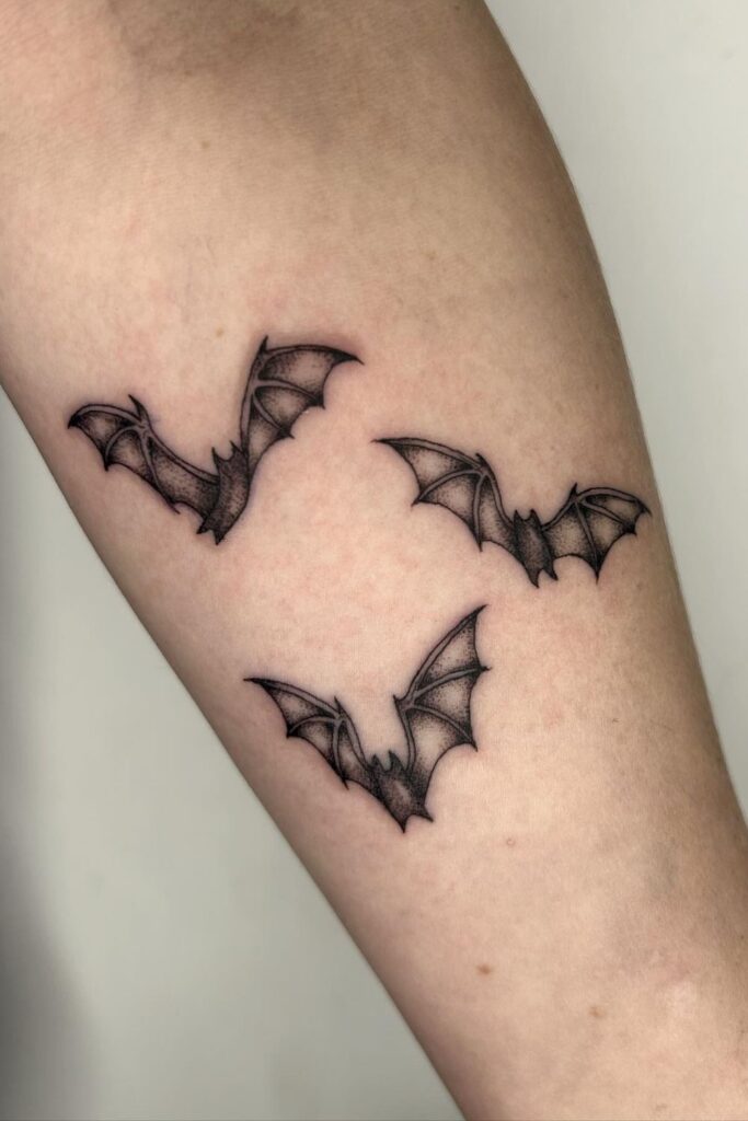 This trio forms a flock of bats tattoo, artfully arranged in mid-flight to represent freedom, evolution, and new beginnings.