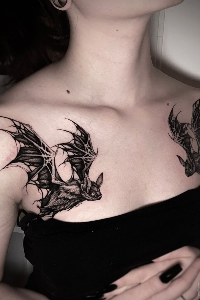 For tattoos with heavy black ink, like gothic or bat chest tattoos, regular moisturizing and sun protection are essential to keep that crisp contrast alive for years to come.