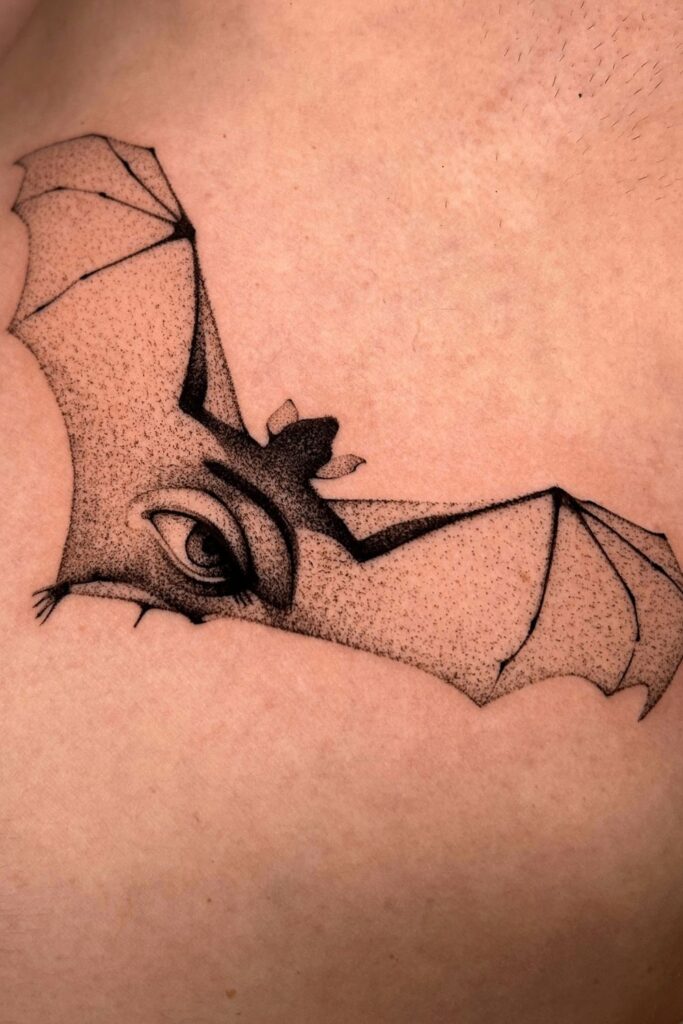 This detailed bat tattoo by vladsnitarencotattooer is both surreal and mysterious, blending the form of a bat in flight with a strikingly human eye.