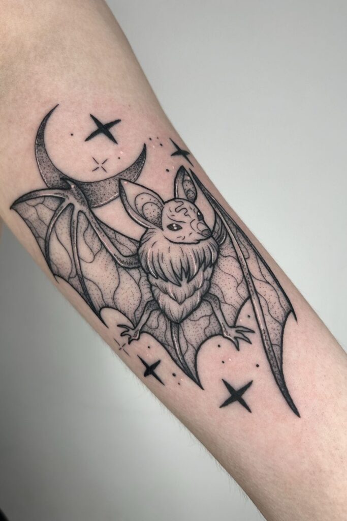Surrounded by moons and stars, this mystical bat by poppyoliviatattoo flies through a night sky, blending cute bat tattoo charm with cosmic energy.