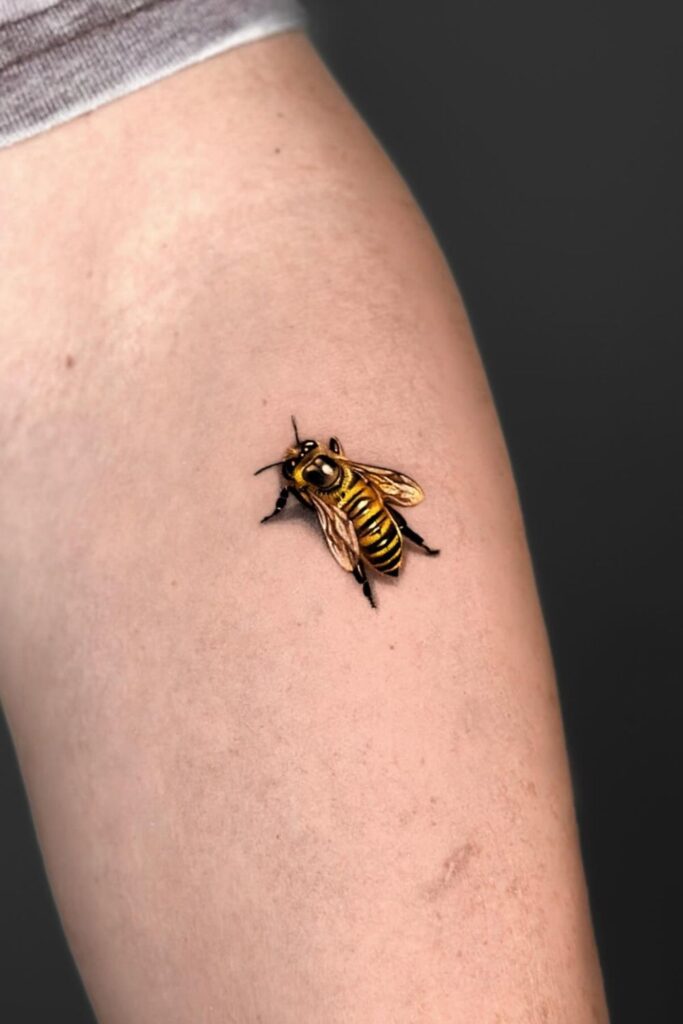 Perfect for wrists, ankles, or behind the ear, tiny bee tattoos prove that small doesn’t mean insignificant.