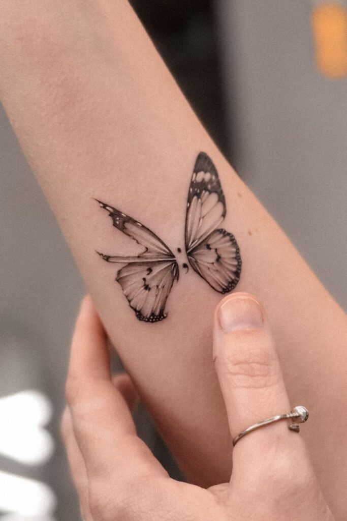 Some people choose a semi colon tattoo butterfly meaning as a powerful tribute to survival and mental health advocacy.