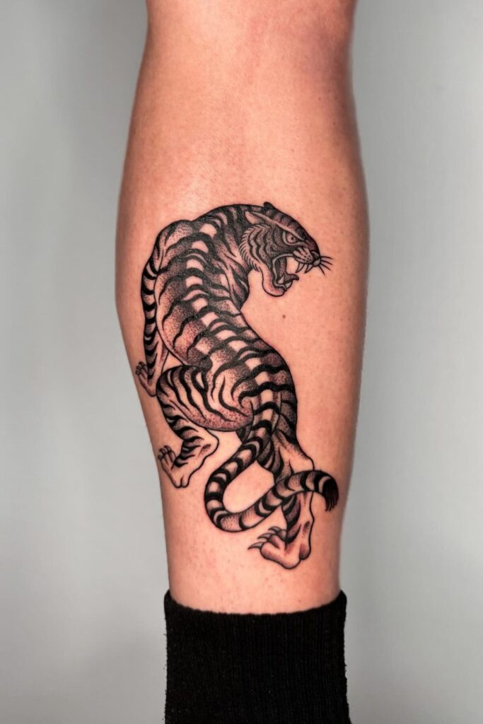 The sharp contrasts and realistic shading make it an eye-catching piece for those who want a bold, commanding presence on their calf.