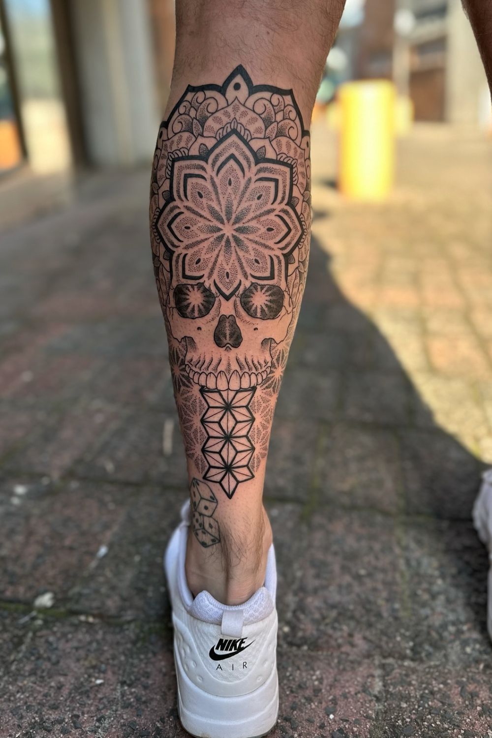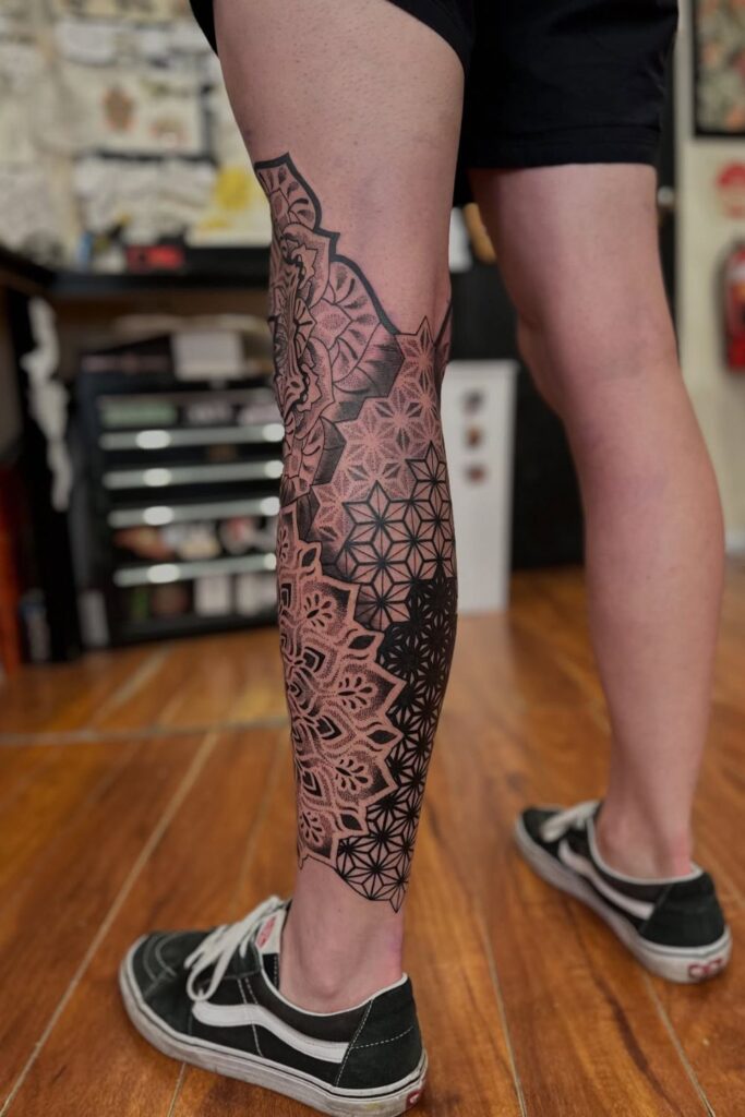 This dotwork mandala calf tattoo by joekintztattooing combines bold blackwork and delicate shading, creating a sense of spiritual grounding and power.