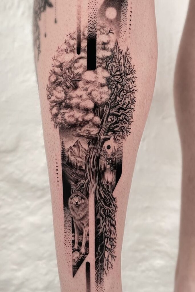This intricate nature scene tattoo by hood.seven showcases a wolf, a deer, a towering tree, and a starry night sky, symbolizing the balance between strength and serenity.