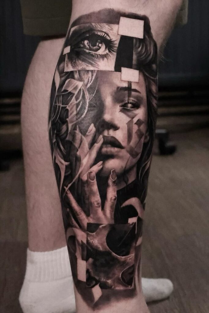 The natural shape of the calf enhances the flow of artistic elements, making it a prime location for tattoos with depth and dimension.