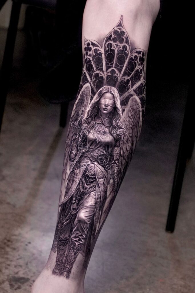 Blindfolded Justice Angel Calf Tattoo: Symbol of Truth and Strength