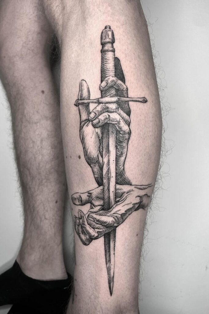 Hand and Sword Calf Tattoo: The Warrior’s Oath
